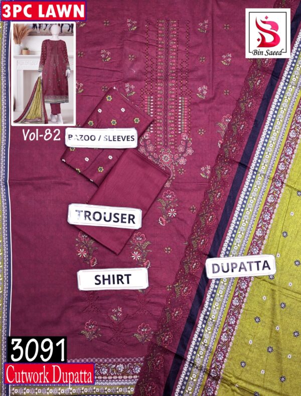 BIN SAEED 3PC LAWN CUTWORK EMB DIGITAL PRINTED VOL-82 BSL-3091