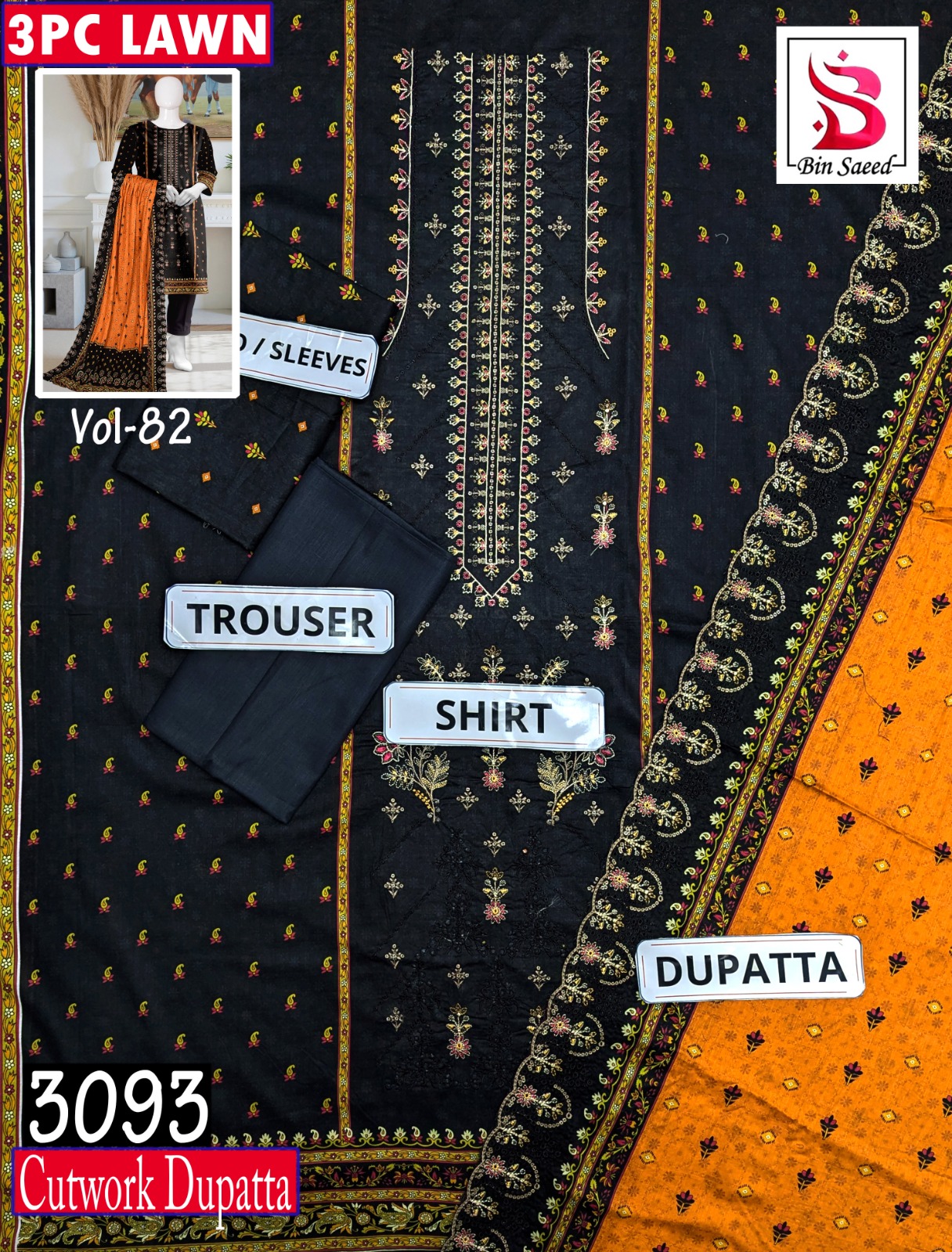 BIN SAEED 3PC LAWN CUTWORK EMB DIGITAL PRINTED VOL-82 BSL-3093