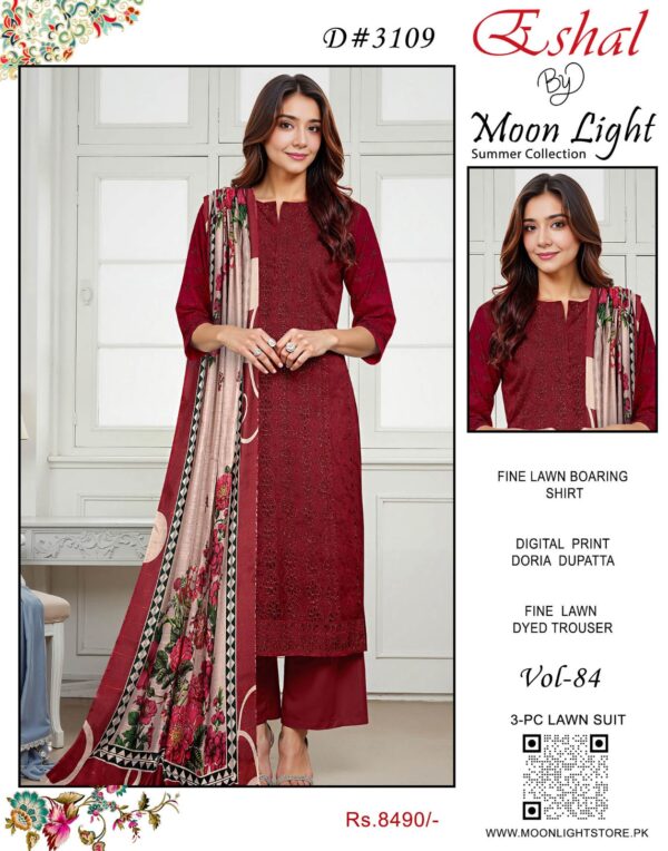 MOONLIGHT 3PC EMBROIDRED CHICKEN KARI BOARING LAWN VOL-84 MB-3109